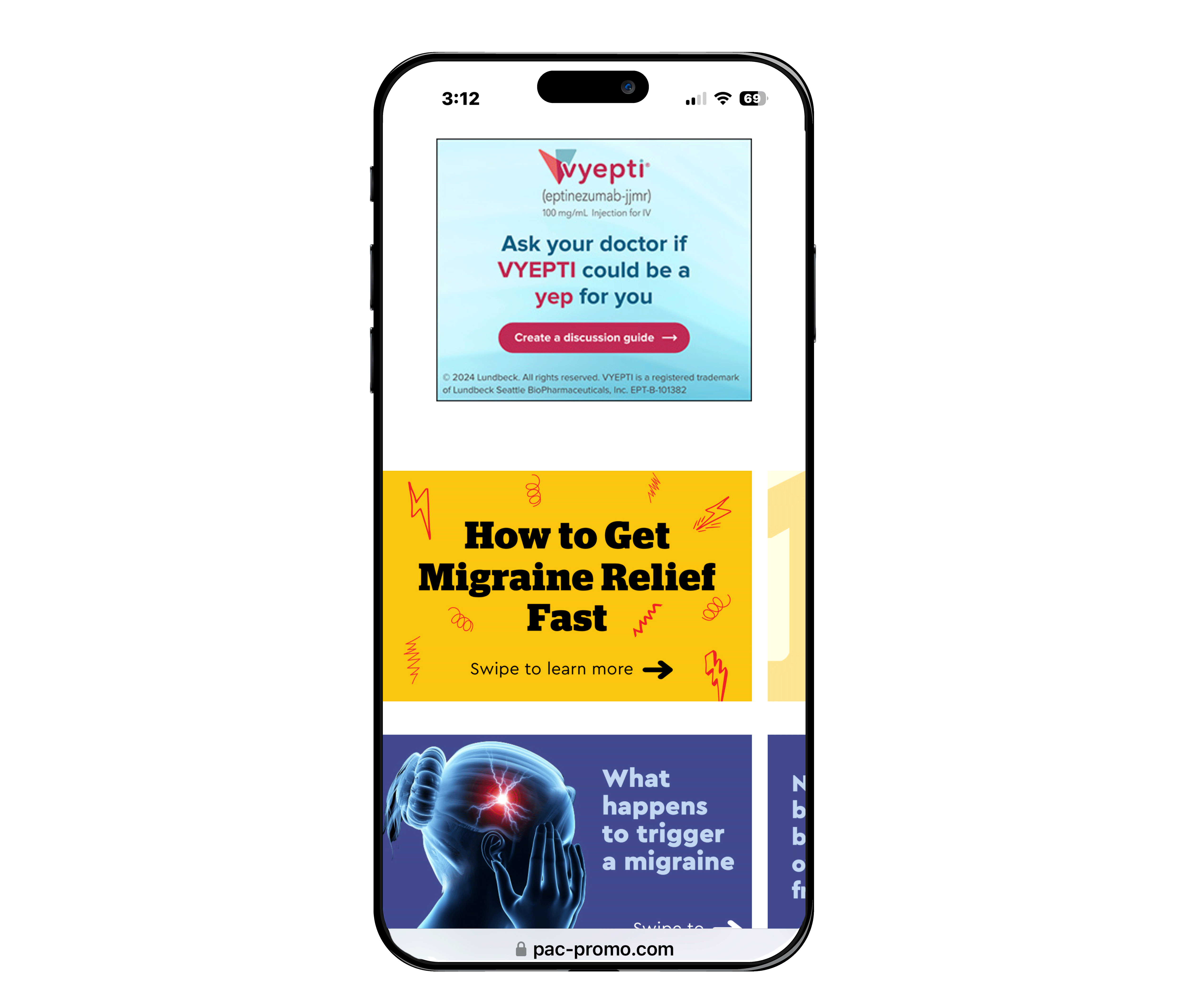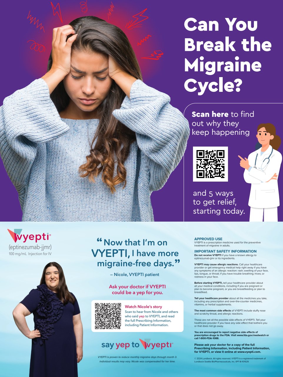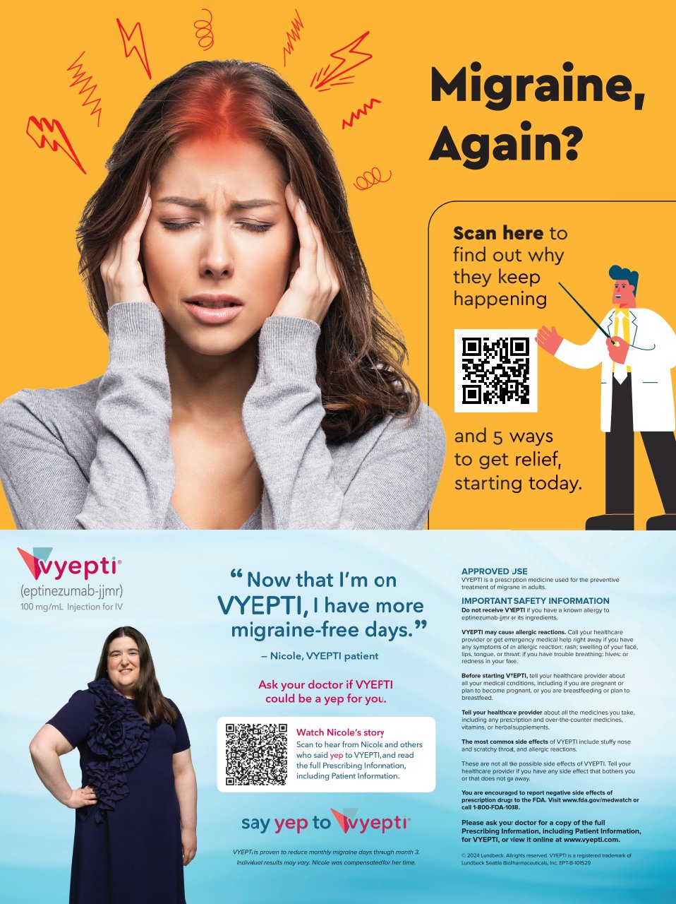 The following is the Vyepti campaign that I concepted and created consisting of a poster series to be displayed in doctors offices. The posters incorporate a QR code that directs the audience to an educational landing page.